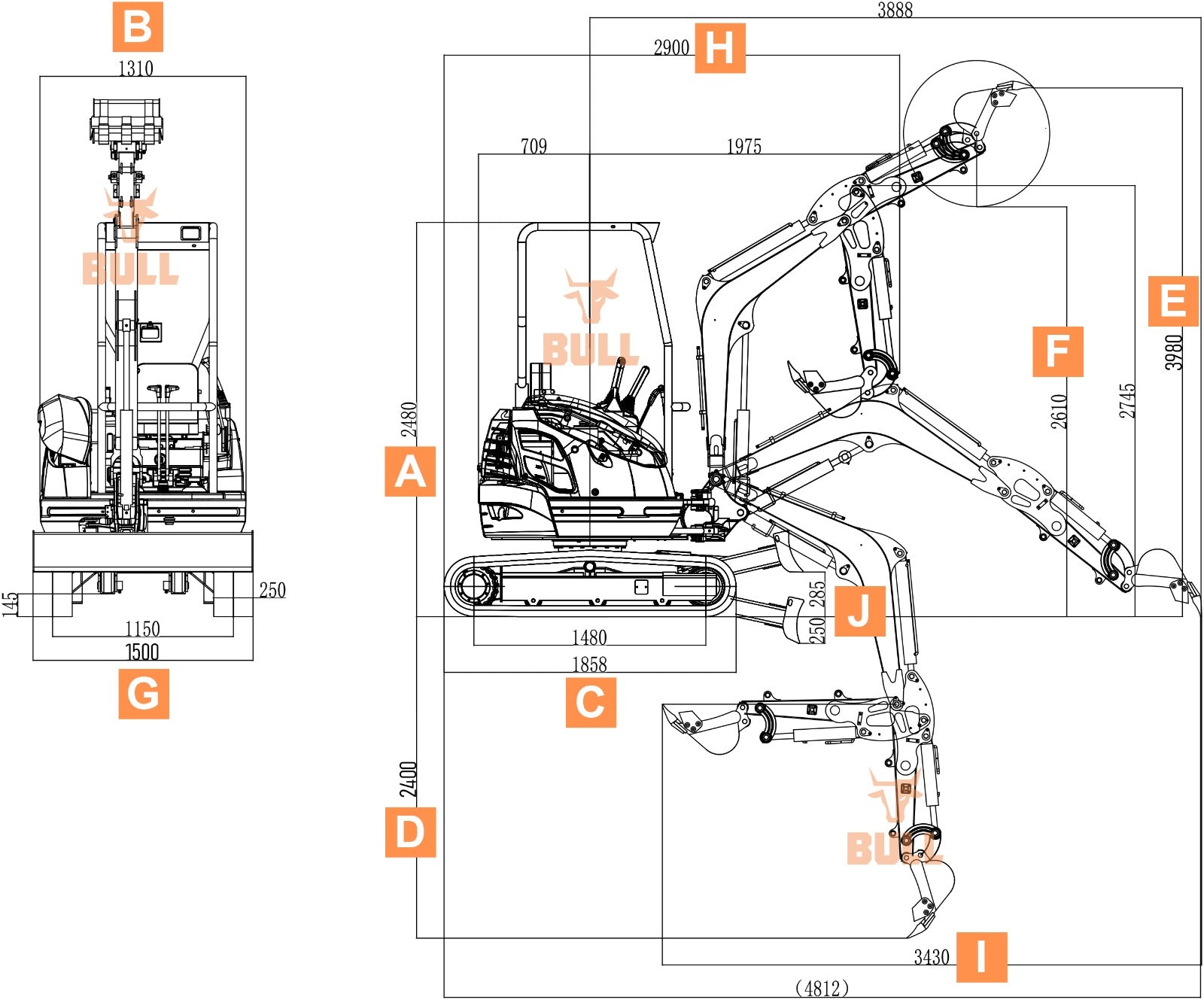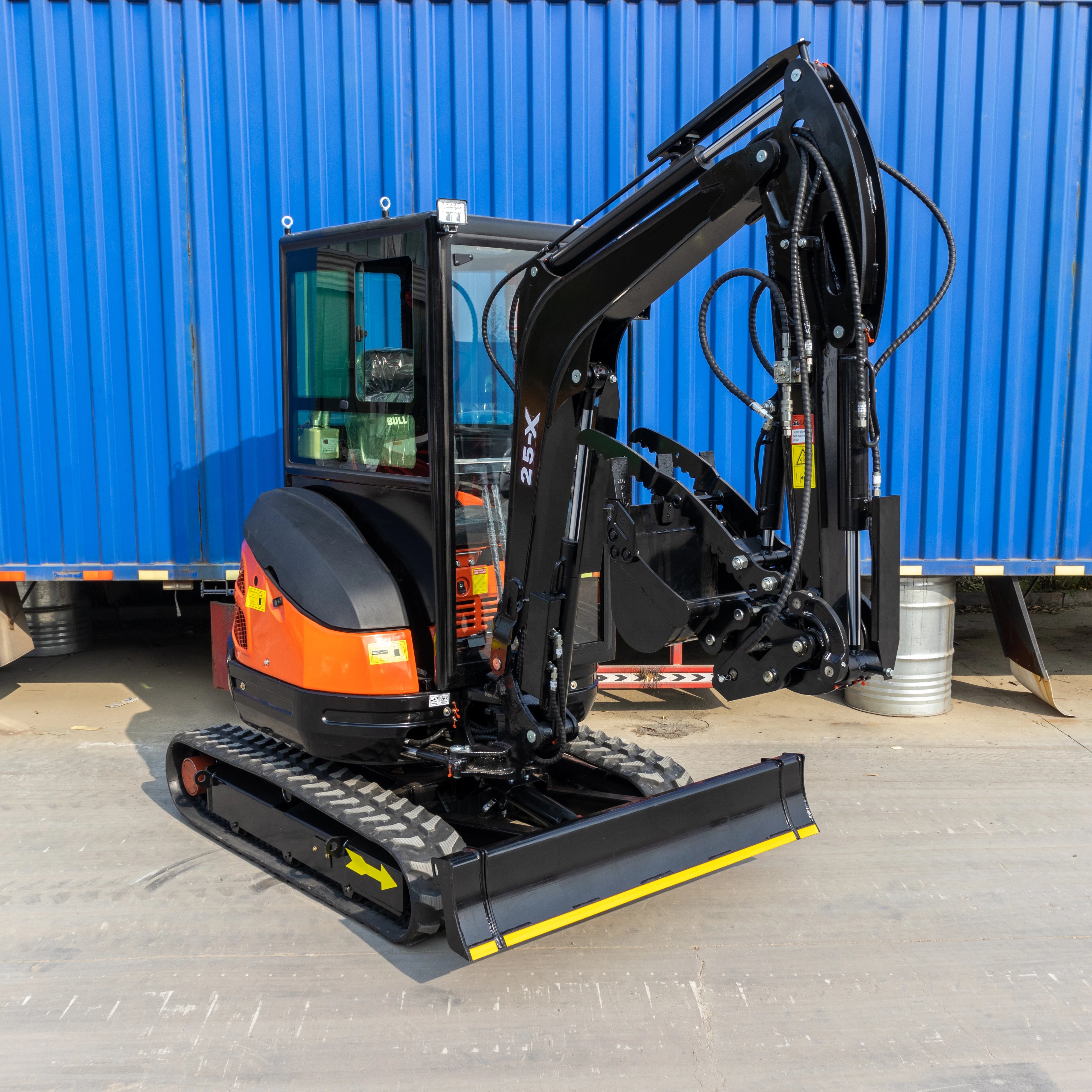 Découvrez la mini-pelle BULL dans différentes configurations et situations, angles de travail, équipements, détails techniques et usages terrain.